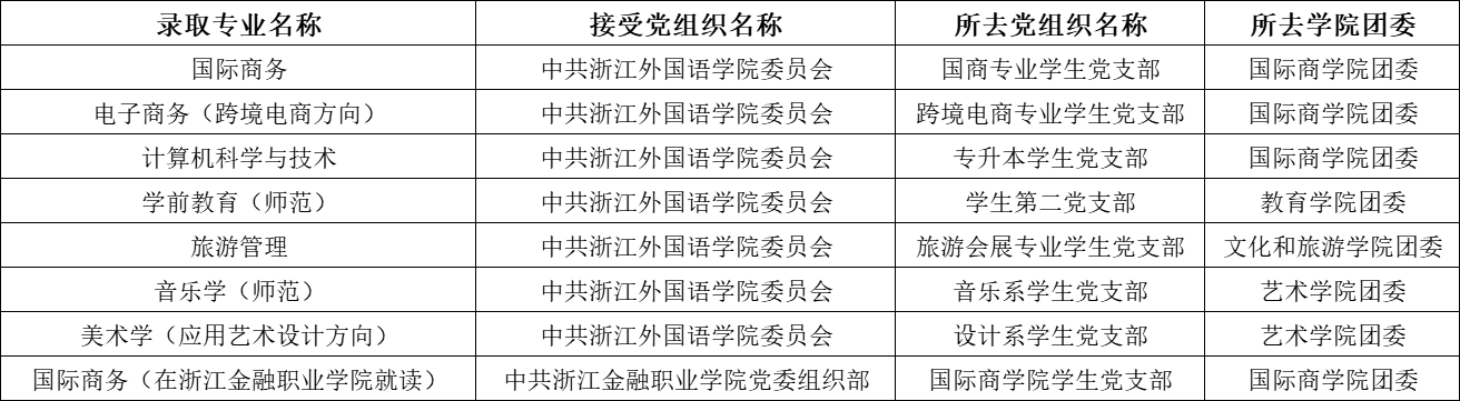 录取新生政治面貌为团员的,由学生本人、毕业院校所在团支部或毕业院校团委在“智慧团建”上申请转入浙江外国语学院各二级学院团委(具体班级未定,暂时不用选择)。